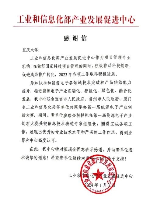 近日,工业和信息化部产业发展促进中心(简称中心)专程来人送达了给五楼自拍 以及 五楼自拍 廖瑞金教授的感谢信。中心对五楼自拍 在积极推进能源电子科技创新、促进成果推广转化中所给予的工作支持表示衷心的感谢。信中特别对廖瑞金教授能够担任第一届能源电子产业创新大赛关键信息赛道专家组组长,并圆满完成各项工作表示诚挚的谢意。 廖...