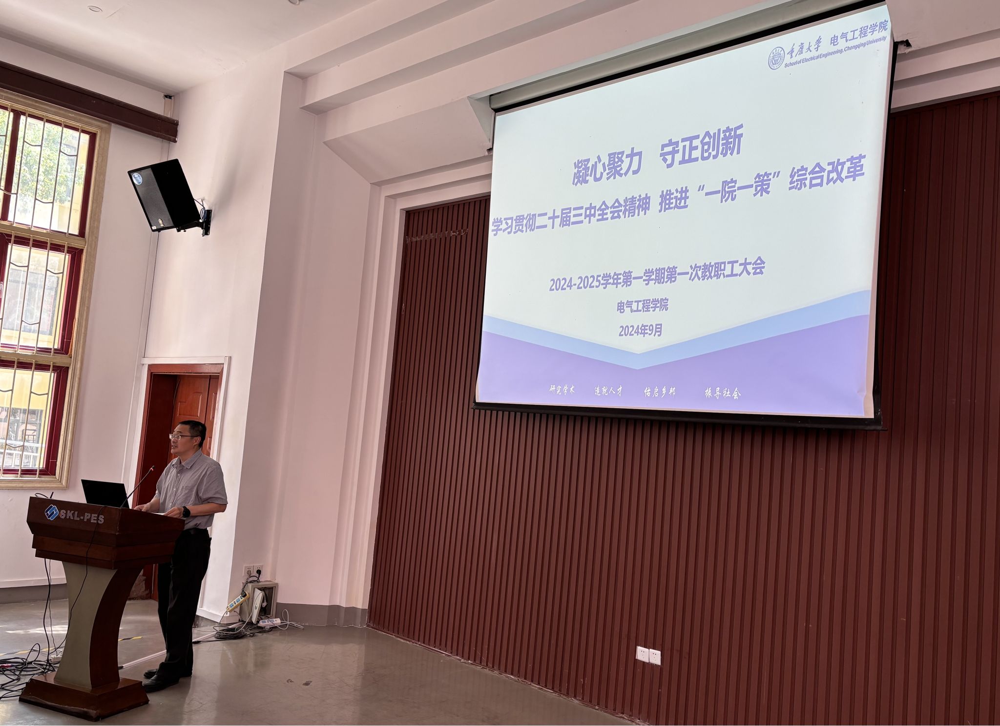 2024年9月12日下午, 五楼自拍 在六教6117报告厅召开2024-2025学年第一学期首次教职工大会。会议介绍了本年度新进教师,传达了学校最新精神并通报部署了学院新学期工作安排等。学院党委书记胡建林,院长谢开贵,党委副书记王晓静,副院长杜雄、杨鸣、王强钢,输变电装备技术全国重点实验室副主任李辉、曾礼强出席会议。大会由王晓静副书记主持。 胡建林首先传达了王树新校长在2024年秋季学期开学干部大会上的报告精神。...