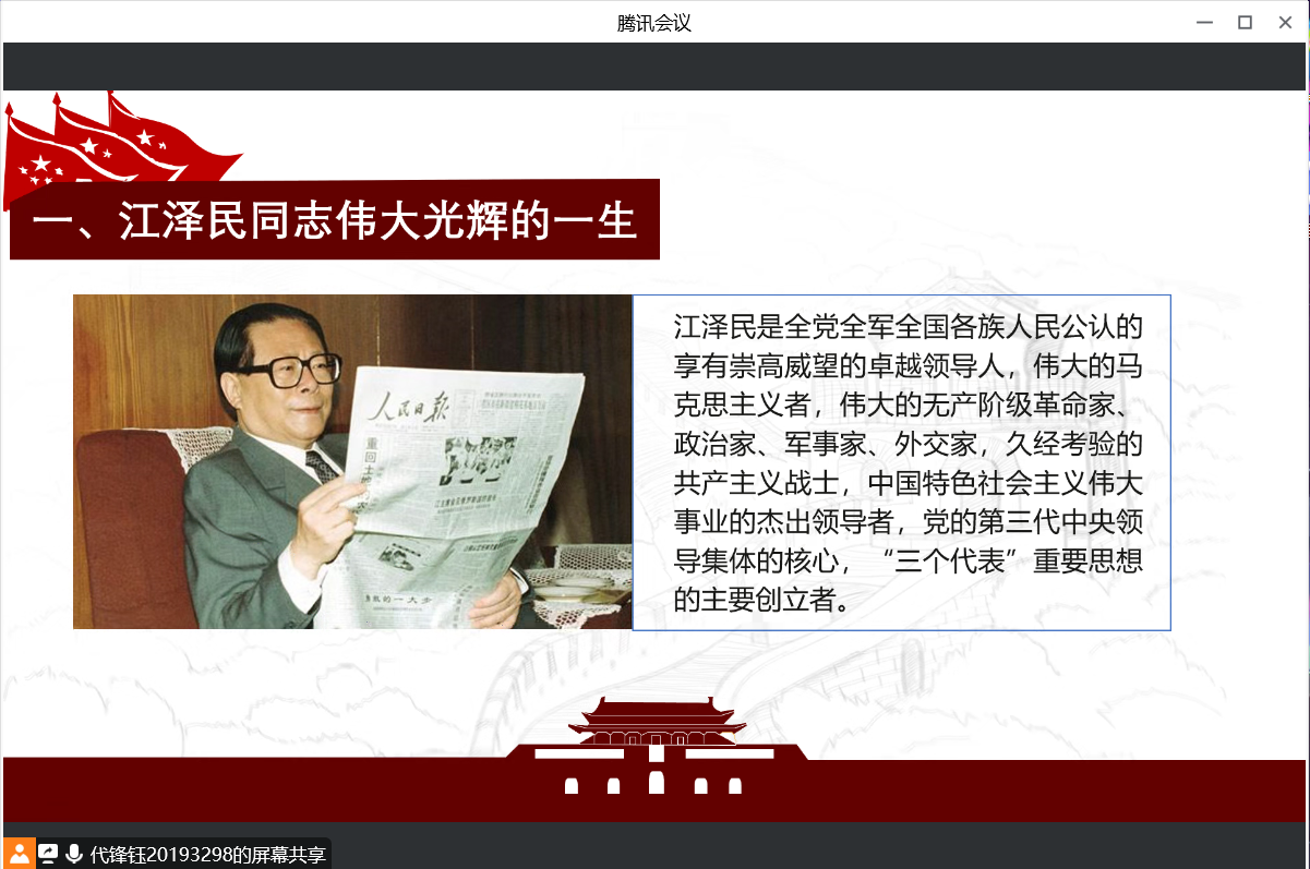 2022年12月15日下午,为了弘扬伟大建党精神和延安精神, 五楼自拍 本科生一支部通过腾讯会议在线上开展了“不惧时代挑战,共建美好未来”的主题党日活动。本次党日活动由 五楼自拍 本科生一支部第五小组成员代锋钰同志主持,本科生一支部全体党员参加。本次党日活动主要由两个部分组成:一是深切缅怀江泽民同志;二是弘扬伟大建党精神和延安精神,为实现党的二十大提出的目标任务而团结奋斗。图1 回顾江泽民同志的一生会...