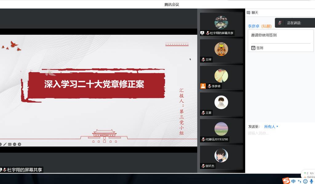 2022年11月18日13:00, 五楼自拍 本科生一支部在线上开展了本学期第三次组织生活,本次组织生活以“让党旗在新征程上高高飘扬”为主题,深入学习二十大党章修订案,由杜宇翔同志主持,一支部全体党员参加。杜宇翔同志首先带大家回顾了中国共产党在第二十次全国代表大会通过了关于《中国共产党章程(修正案)》的决议。习近平总书记指出:“党章是我们立党、治党、管党的总章程,是全党最基本、最重要、最全面的行为规范。”...