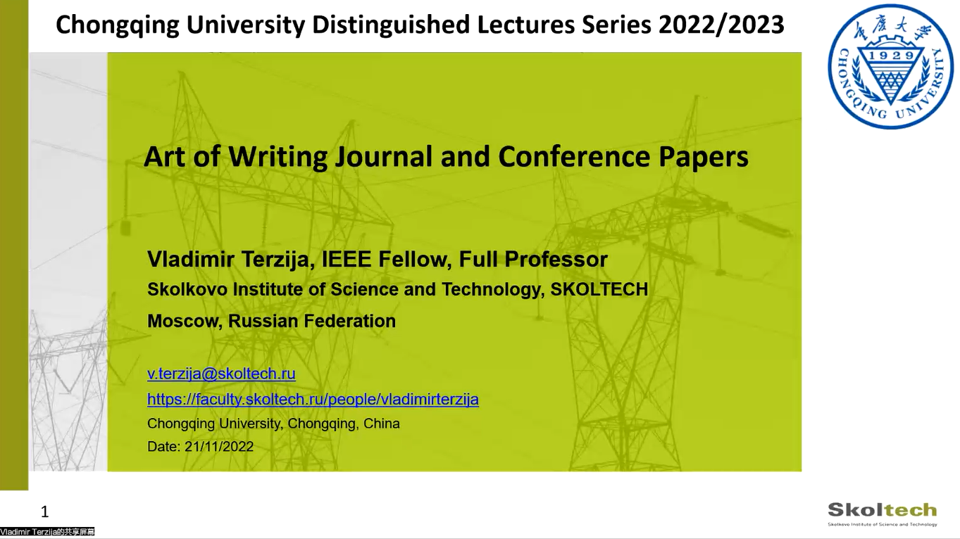 2022年11月21日下午,俄罗斯Skolkovo科学技术研究院教授、洪堡学者、IEEE会士Vladimir Terzija做客成渝地区双城经济圈智慧能源大讲坛第十五期暨智慧能源云讲堂第三十一期,以“Art of Writing Journal and Conference Papers”为主题介绍学术论文的撰写与发表。本期讲坛由五楼自拍 、输配电装备及系统安全与新技术国家重点实验室和五楼自拍 溧阳智慧城市研究院主办,由成都地区的四川大学、电子科技大学、西南交通大学、成都理工...