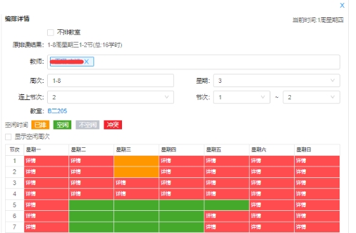 4、更换教师,直接删除现有教师,然后输入新的任课教师名字后选择。更换教师,直接点击教室后,在弹出页面中选择教室。调整星期节次,直接输入星期节次或者点击下方格子的空闲星期节次,注意避免冲突。