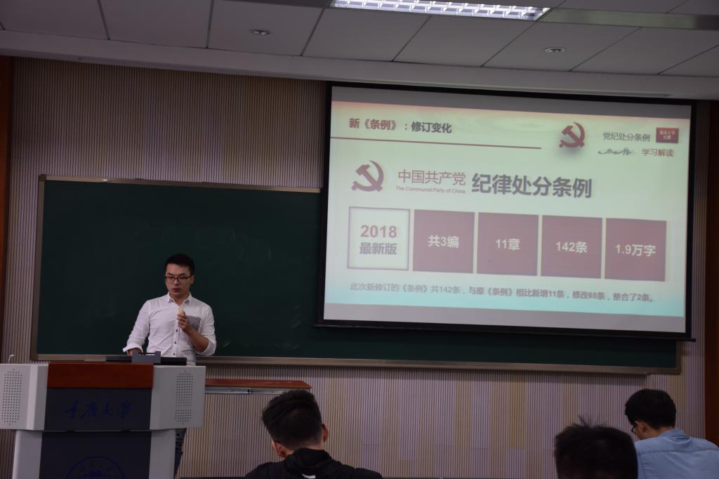 最后,支部成员罗义军同志表示,通过此次对新条例的学习,我们可以看出新条例确实是贯彻了习近平新时代中国特色社会主义思想和党的十九大精神,也是对中央八项规定的具体化。我们要谨记这些政治纪律,对党忠诚,言行一致。最后,组织委员陈沛同志补充说明了一些近期党支部的情况,强调了党员的先进性和组织生活会的纪律性,告诫党员同志们要严守纪律红线,做合格党员。