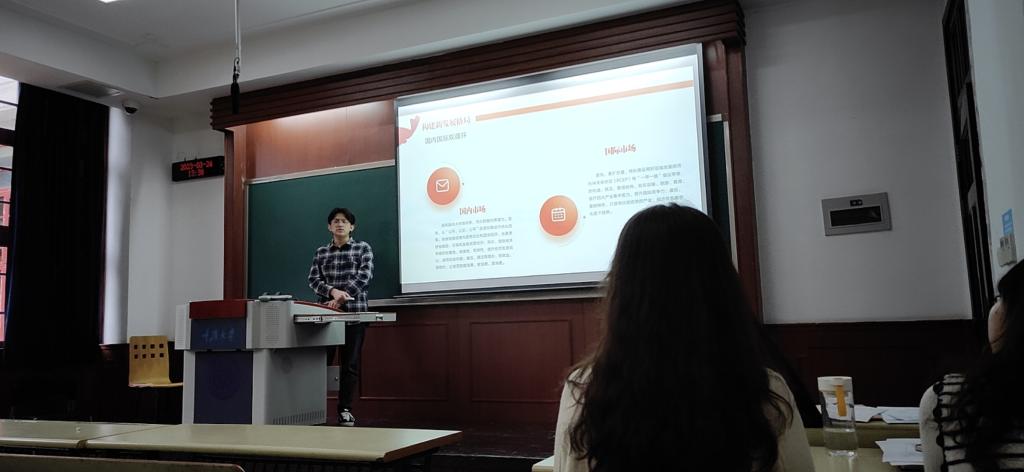 首先汤靖同志进行了第一部分内容的讲解。通过PPT展示,汤靖同志为我们详细介绍了“什么是两会”。他具体介绍了全国人民代表大会,中国人民政治协商会议的由来,以及今年两会召开的时间、参与人员以及两会的意义。同时,汤靖同志带我们回顾了本次两会的重要事件,习近平总书记全票当选中华人民共和国主席、中华人民共和国中央军事委员会主席,以及两任国务院总理的交接。另外,汤靖同志也介绍了本次的政府工作报告的重要内容,包括过去五年国家各方面工作回顾,取得的成就以及今年政府工作的重点。