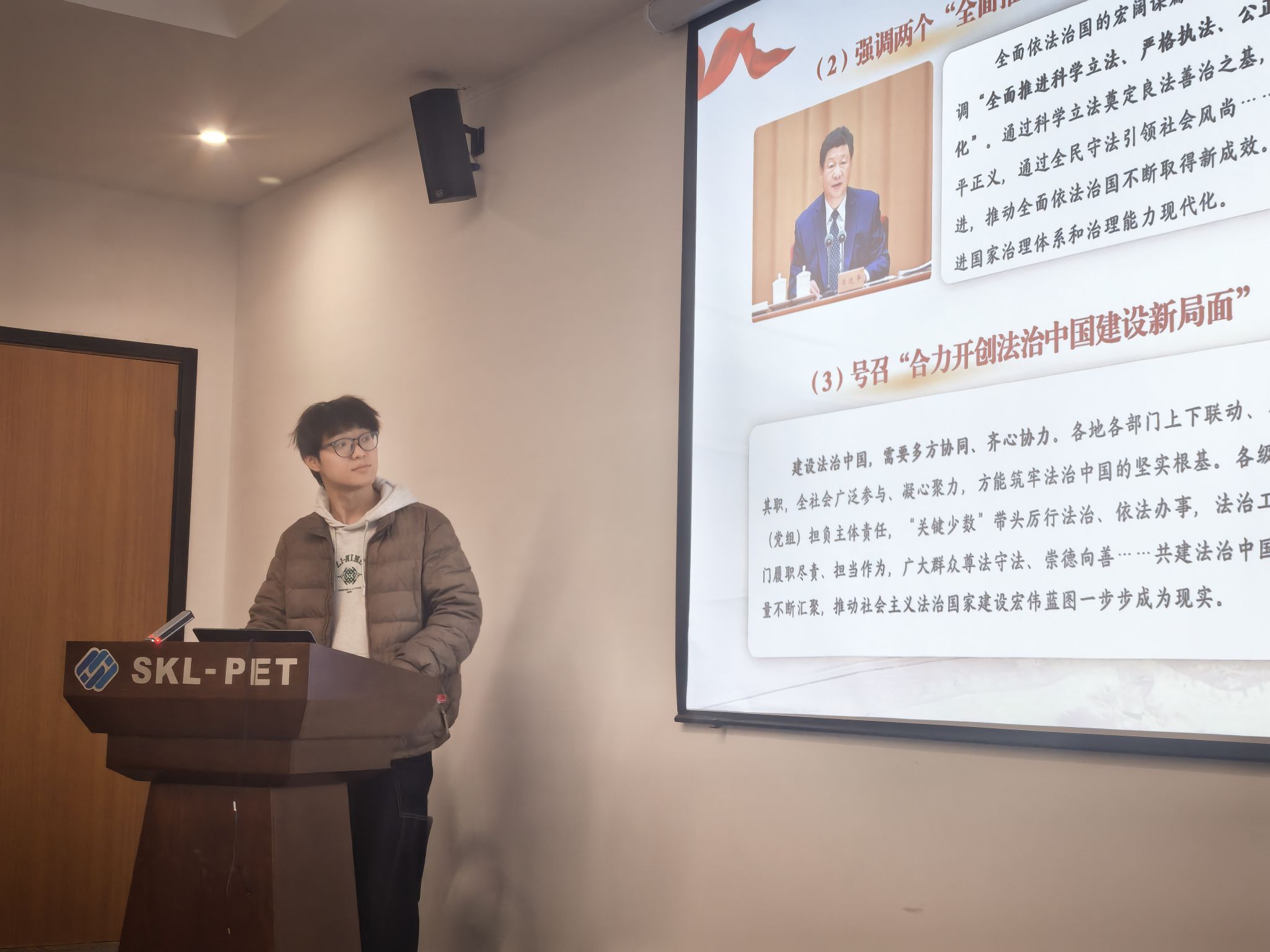 随后,胡浩轩带领大家对全面依法治国的内容进行了详细学习。他梳理了党的十八大以来,我国法治建设的发展脉络。从党的十八届四中全会明确提出全面推进依法治国的总目标,到2020年11月首次中央全面依法治国工作会议召开,将习近平法治思想明确为全面依法治国的指导思想,再到二十届四中全会对法治新格局的部署,清晰呈现了法治中国建设的演进历程。他着重阐释了习近平总书记对全面依法治国工作作出重要指示强调内容中的“两个更加注重”的核心要求,号召支部党员自觉尊法学法守法用法,在课程实验、科创项目中树立法治思维、提升法治素养,筑牢高质量发展的法治根基。