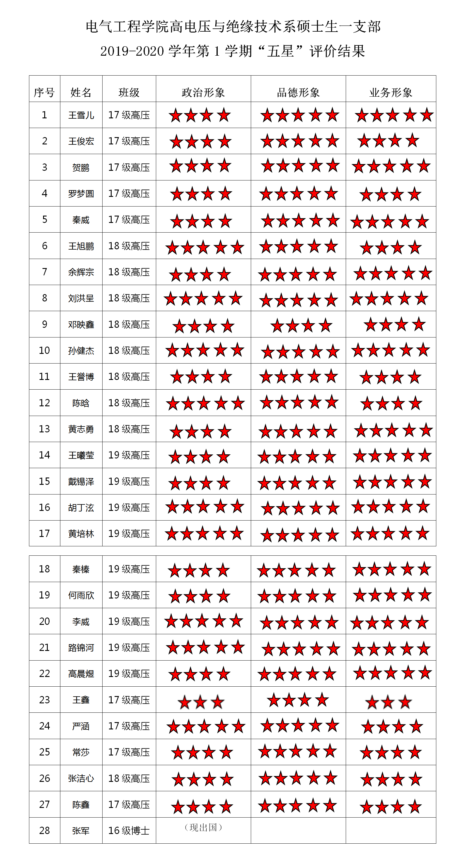 五楼自拍 高电压与绝缘技术第一支部 2019-2020学年第1学期“五星”评价结果
