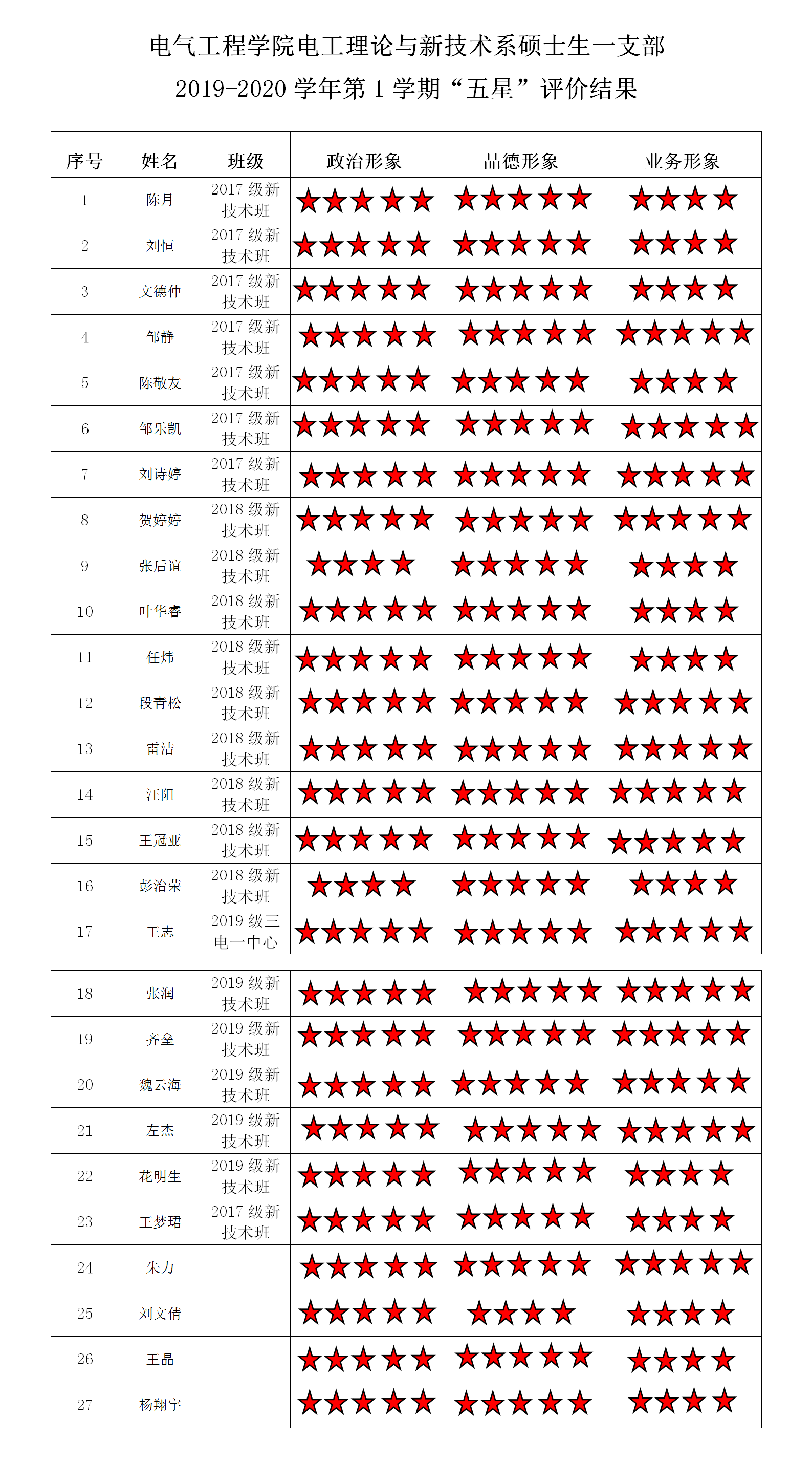 五楼自拍 电机与电器系硕士支部 2019-2020学年第1学期“五星”评价结果