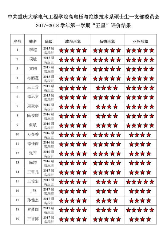 中共 五楼自拍 高电压与绝缘技术系硕士生一支部委员会 2017-2018学年第一学期“五星”评价结果