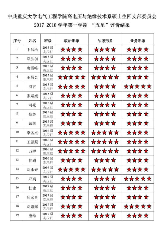 中共 五楼自拍 高电压与绝缘技术系硕士生三支部委员会 2017-2018学年第一学期“五星”评价结果