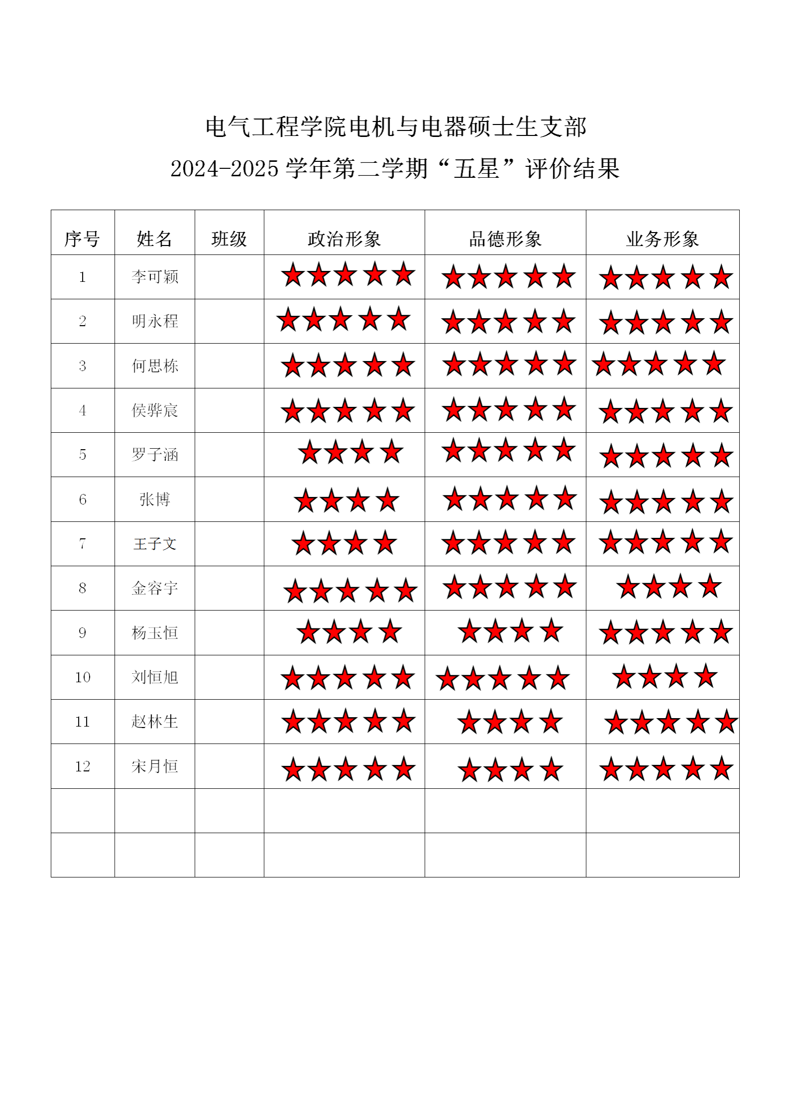 五楼自拍 电机支部 2024-2025学年第二学期“五星”评价结果