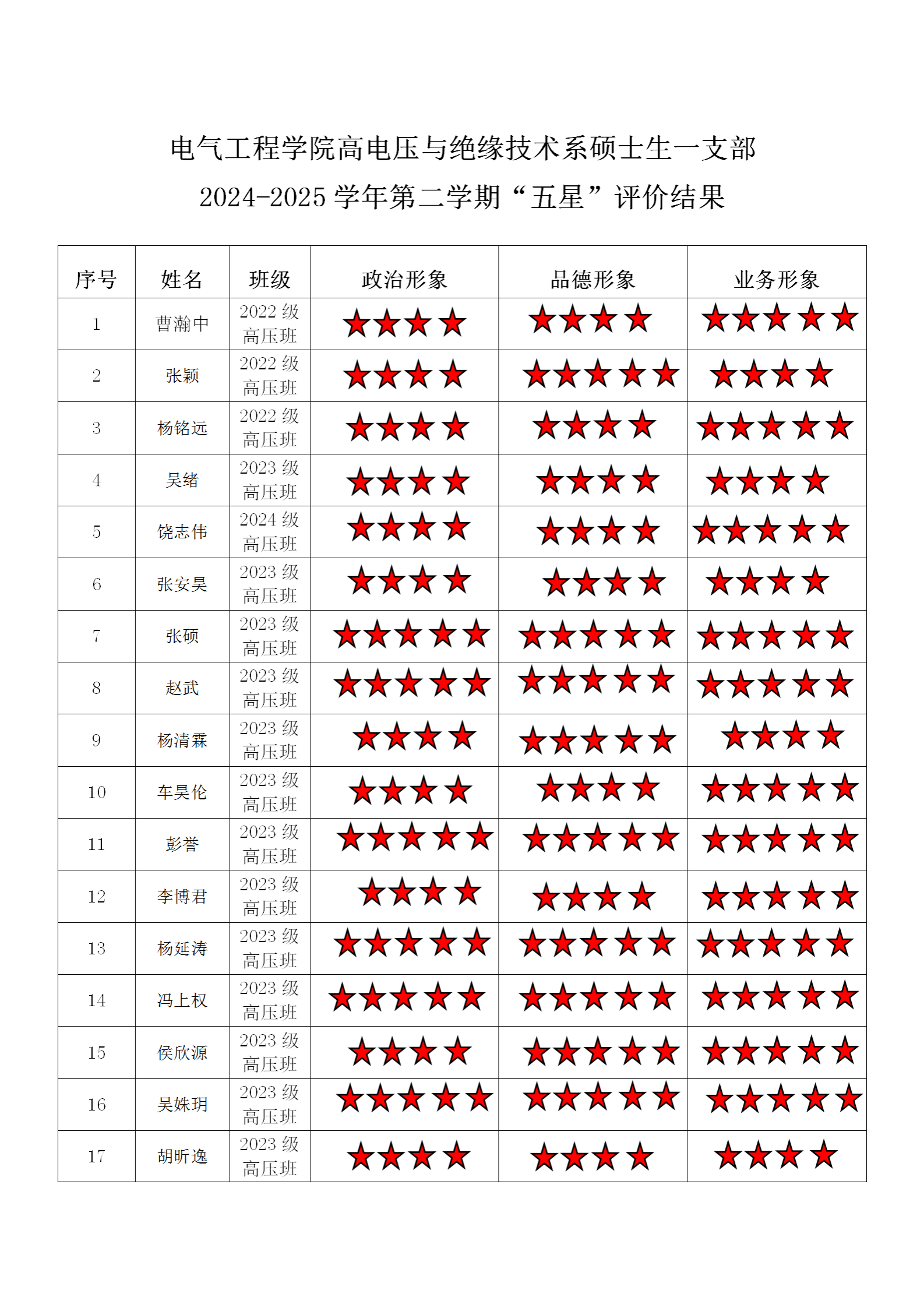 五楼自拍 高压一支部 2024-2025学年第二学期“五星”评价结果