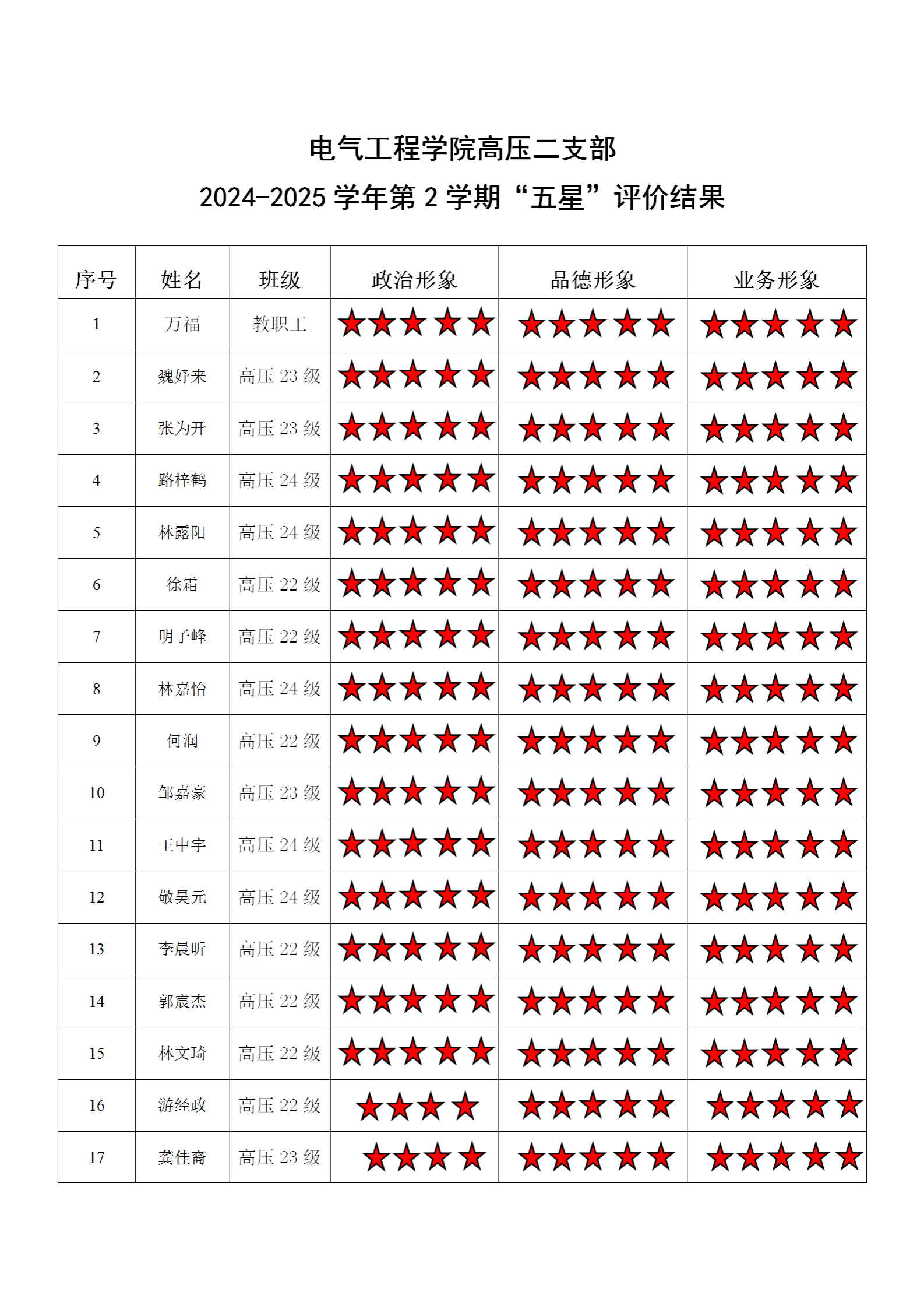 五楼自拍 高压三支部 2024-2025学年第二学期“五星”评价结果