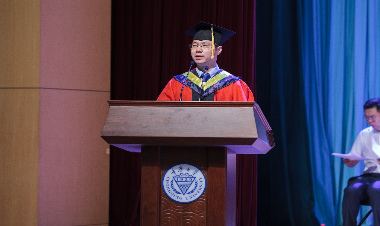 教师代表胡博老师致辞,在2021届重大电气学子即将展翅高飞之际,他谆谆教导毕业生们要踏踏实实做研究,立志明德,向优秀学习。胡博老师鼓励同学们抓住百年盛世的历史机遇,投入到中华民族伟大复兴的新征程中。