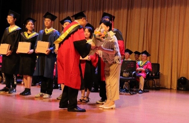 孙才新院士教育基金管理委员会主席吴绍琪教授致辞。她祝贺同学们结束了一个阶段的学习历程,顺利毕业并学业有成。她表示,建党百年,重任在肩,同学们要学习伟人精神、培养中华家国情怀,坚定民族自信心。吴绍琪教授、谢开贵书记为6名2021届毕业生代表赠送纪念品。