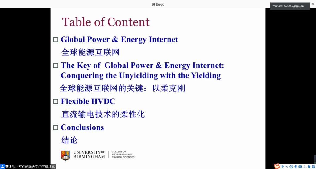 随后,张小平教授以《全球能源互联网的关键:以柔克刚》为主题给大家做了精彩的分享。张教授主要从四个部分深入浅出地为大家介绍了全球能源互联网。