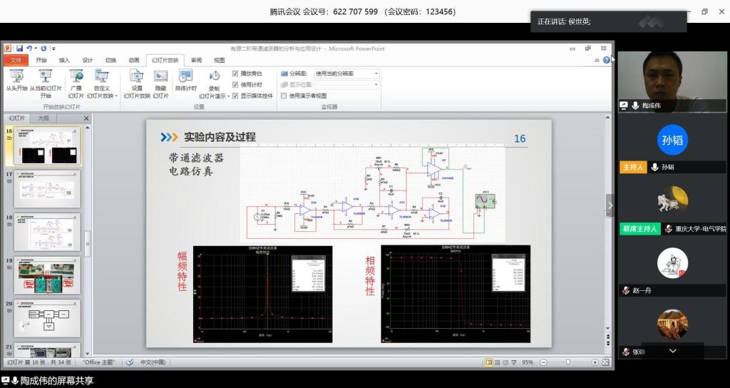 会议由王唯主持,并邀请了侯世英、周静、张谦、孙韬作为专家评审。参赛教师代表为赵一舟和陶成伟,其参赛题目分别为《有源二阶带通滤波器的分析与应用设计》和《基于趣味性图形化编程的风扇设计》。