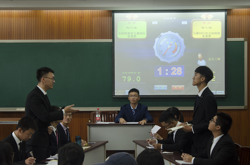 2019112日下午14时,电气学院2019级新生辩论赛半决赛于D1320D1321正式打响。经过前两轮的角逐,共有四班、五班、八班和十班四个班级进入半决赛。此次辩论赛半决赛,各班辩手以“与谁同行和去向何处的重要性”为论题,展开激烈而精彩的辩论。