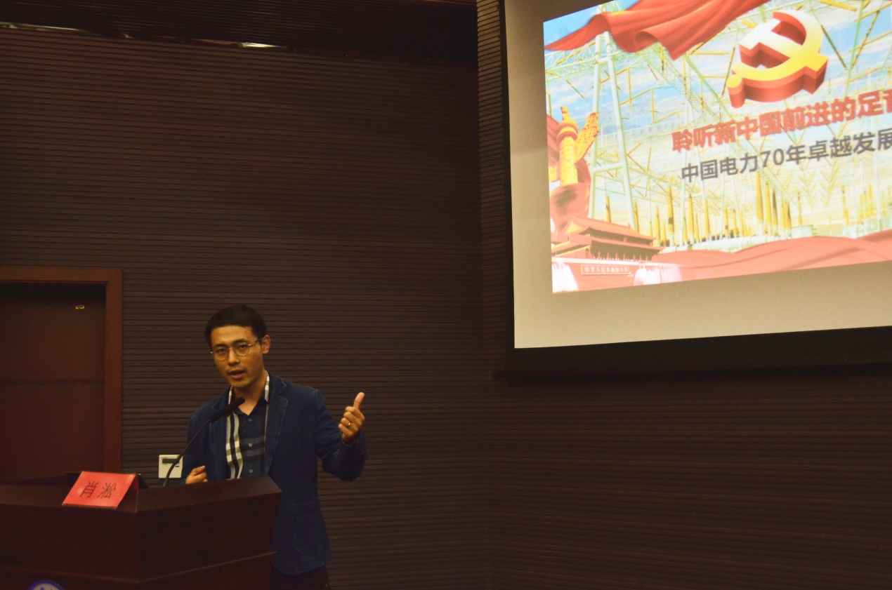 接着由肖淞校友进行做报告分享。他以“聆听新中国前进的足音 中国电力70周年卓越发展”为主题,从“中国速度 电力奇迹”、“中国名片 大国重器”、“中国力量 基层工作”、“中国科技 点亮未来”四个方面展开。从筚路蓝缕的中国电力发展史到中国电力的三大名片,从一线电力工作者在“刀锋”上起舞到“中国制造”的日新月异,强调中国电力发展所获得的成就是中国电力人共同努力的结果、是中国电力人艰苦奋斗的回报。肖淞校友获得的成绩,得益于国家、得益于学校、得益于学院,在成功之后还不忘学校,懂得感恩,佑启乡邦,振导社会,是值得我们学习的好榜样!