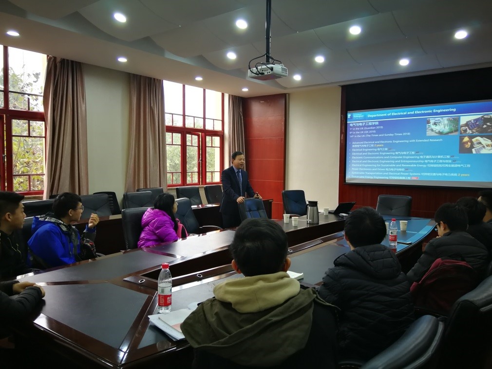 计划参与“3+2”、“4+1”项目的学生进行宣讲会,介绍了诺丁汉大学的校园环境、软硬件设备等基本情况,介绍到电气与电子工程学院的各个专业方向,重点介绍了“3+2”、“4+1”项目的课程体系设置、学位类型与区别、培养环节与要求等。在宣讲提问环节,同学们发问积极,就申请资格和注意事项、就业前景和升学前景、费用等问题进行提问,朱教授非常热心诚恳地一一讲解。