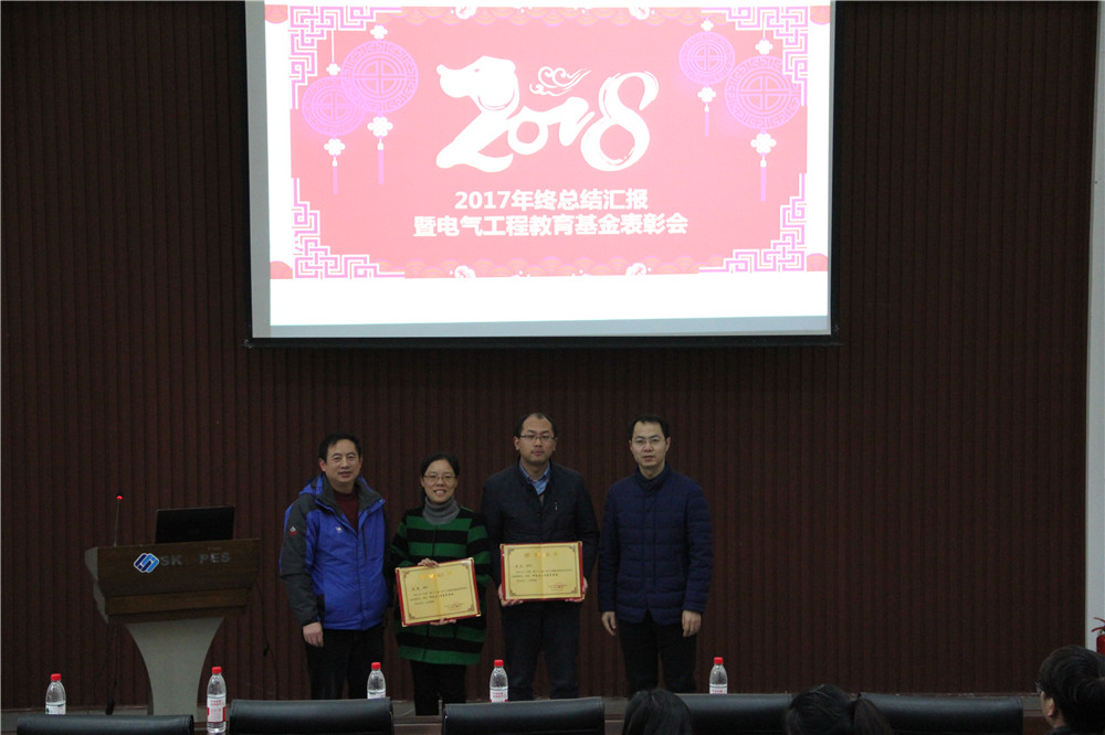 党委书记周林教授宣读电气工程教育基金奖表彰决定(电院[2018]2号文件),授予廖瑞金、李成祥、韩力3位老师2017年度电气工程教育基金“突出贡献奖”,授予王明渝、彭文雄2位老师2017年度电气工程教育基金“本科生人才培养类奖”,授予余娟、曾正2位老师2017年度电气工程教育基金“研究生人才培养类奖”,授予卢至老师2017年度电气工程教育基金“实验室类奖”,授予邹琳老师2017年度电气工程教育基金“管理类奖”,授予黄洪松等5名学生2017年度电气工程教育基金“优秀学生奖”。并对受表彰的先进个人表示祝贺,希望他们不忘初心、牢记使命,为学院作出更大的贡献。