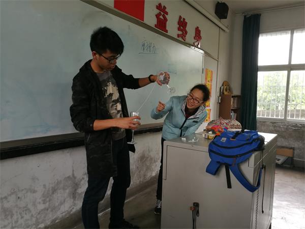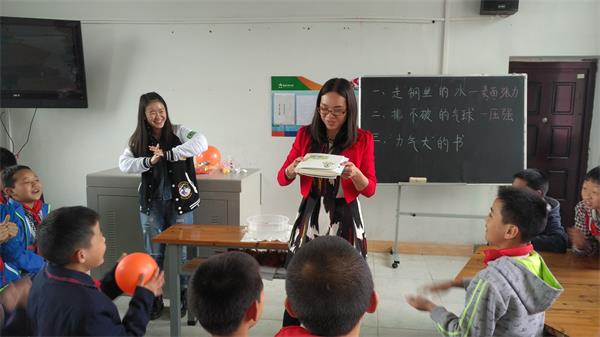在本次支教前,志愿者们进行了认真而全面的前期准备,在负责人的带领下进行了多次预实验,并还原实验原理,对实验的可行性及预期效果进行了详细的记录。一到学校,孩子们便好奇地围了上来,一双双充满希望的眼睛注视着志愿者们手中的实验器材,猜测着今天迎接他们的会是怎样的惊喜。实验伊始,志愿者们先以实验“扎不爆的气球”将同学们引入了科学的殿堂,大家展开想象,争先恐后地回答问题,将自己的猜测与大家分享,课堂的氛围瞬间变得轻松活跃。实验进行的非常顺利,在志愿者们的引导下,同学们依次见证了“黏合起来的书”、“水走钢丝”等几个实验现象。在进行实验“黏合起来的书”时,课堂气氛一度达到高潮,大路小学“科技支教”负责老师吴老师同样对实验表现出了浓厚的兴趣并与同学们共同参与一起完成了实验。吴老师亲切地讲到:“以科技小实验的方式解释生活中的小常识,同学们既能愉快地明白了实验原理,又能提高了动手实验能力,还为未来的学习打下一定的基础。”