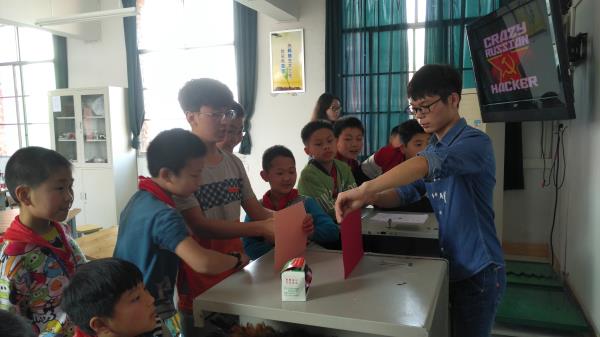 与此同时,大路小学支教活动也在如火如荼地开展。志愿者们如往常一样进行了自我介绍,在孩子们的期待中开始了本期的科技课堂。志愿者先在黑板上画出了玩具弹簧枪的模型图,并向孩子们提问弹簧枪的原理。孩子们热情高涨,很快就有孩子站起来主动回答问题。在讲解完了弹簧枪的原理后,志者们开始讲解的主题——“弹性势能”并开始今天的第一个实验—“飞的更高的吸管”。伴随孩子们的阵阵惊呼,吸管真的飞的更高了。为了让孩子们可以亲身体会到实验,志愿者们让孩子们分组进行实验,然后向孩子们提问原理,借着刚才玩具弹簧枪的启发,很快就有孩子主动站起来回答问题。进行了实验以后,本学期支教的力学知识就讲完了。志愿者们精心挑选了力学部分的经典实验,为孩子们回顾了力学知识——张力、作用力与反作用力、浮力、压强等知识。在小结的最后,志愿者们播放了一段精心准备的实验片段,让孩子们更加深刻地记忆下了所学习到的知识。结束了力学知识,志愿者们又开始了光学知识的介绍。志愿者们先用“光有颜色吗?是否见过彩虹?”等问题来启发孩子。然后开始了光学第一个实验—“光的直线传播”,并且举例树阴中的阳光来联系生活,让孩子们很快理解了“光沿直线传播”这一个概念。一个小时的课堂很快就结束了,在孩子们意犹未尽的眼神中,我们结束了本期的课堂。