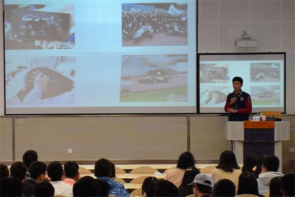 的研究生程章格结合自身经历,经由生动诙谐的语言,把自己经由电子设计的斑斓履历娓娓道来。用其可圈可点的真实人生经历勉励各位参赛者珍惜机会,把握资源,以本次电工电子技能竞赛为契机,学习相关知识,锻炼自身能力,完成自我的不断挑战和蜕变。同时,程章格将其各项新奇精巧的电子设计作品和曾在方程式赛车队间大放异彩的成果以照片和视频的形式在现场与各位参赛者分享,获得了在座同学们的赞叹之余,也激发了同学们对本次大赛的热情。在发言的最后,程章格从队友、硬件、软件、平台、比赛准备五方面传经送宝,将竞赛经验倾囊相赠,更将科研精魂薪火相传。