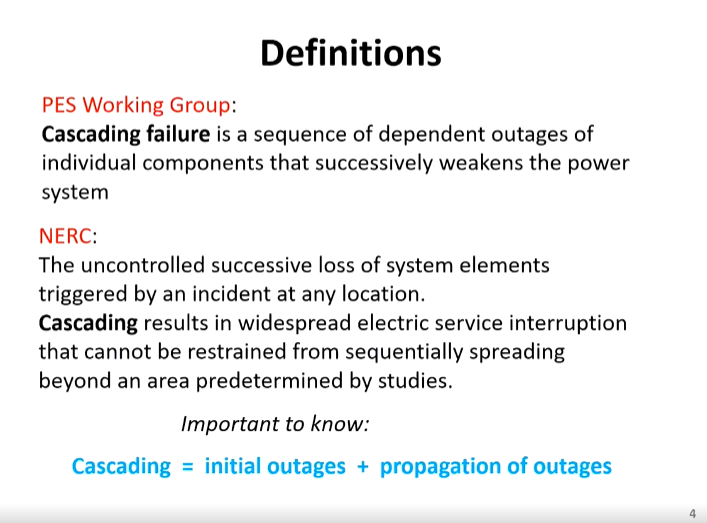 停电对经济和社会的影响可能是灾难性的。Terzija教授首先对电力系统停电和级联中断进行了简要介绍。电力系统停电是指整个电力系统或部分系统的负荷失去供电;级联中断指的是一个事件序列中,一个初始干扰或一组干扰导致一个或多个关联组件的一系列中断,级联会导致广泛的电力服务中断。Terzija教授回顾了近半个世纪的典型停电事故,总结级联故障的原因有安全裕度小、设备老旧、重要设备故障等,且通常表现为多种因素的共同作用。级联故障的罕见和无法预知、大量组合模式、多种产生机制等特性是亟待解决的难题,而通过对级联故障进行研究,可以降低大范围停电的概率和规模。