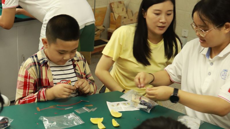 在短暂的休息后,实践队队员带领同学们进行第二个实验——水果发电实验,实验队队员张炳飞在讲台上为小朋友们讲解实验步骤并演示操作,同时在小朋友身边还有志愿者们协助小朋友完成水果发电实验,让小朋友们了解水果发电的过程。通过探究水果发电的秘密,小朋友们领略了科学的魅力,他们也认识到科学就在我们身边,科学来源于生活。