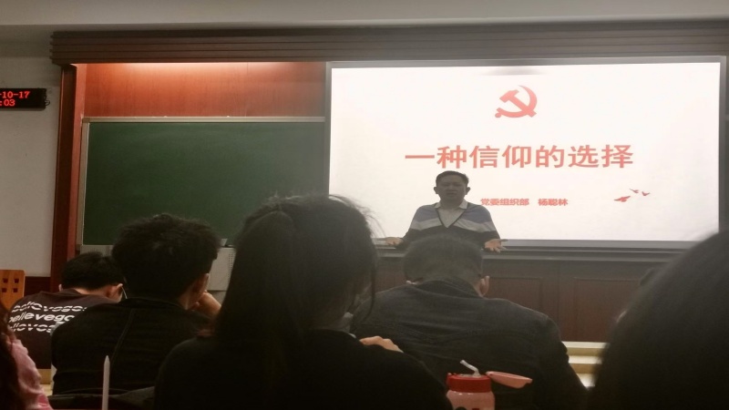 10月17日晚,校党委组织部正科级组织员杨聪林同志为学员们讲授“一种信仰的选择”主题党课。对马克思主义的信仰,对社会主义和共产主义的信念,是我们共产党人的政治灵魂,是我们共产党人经受住任何考验的精神支柱。杨聪林从关于信仰的相关问题、如何选择信仰、如何坚守共产主义信仰、新时期共产主义信仰的新问题与应对之道几个方面为主线,给学员们诠释了何为信仰的选择与坚守。最后,他对学员们提出殷切希望:信仰是一种追求,更是一种力量,没有教科书,没有快捷路,作为新时代的党员,应当初心常坚守、使命长担当。
