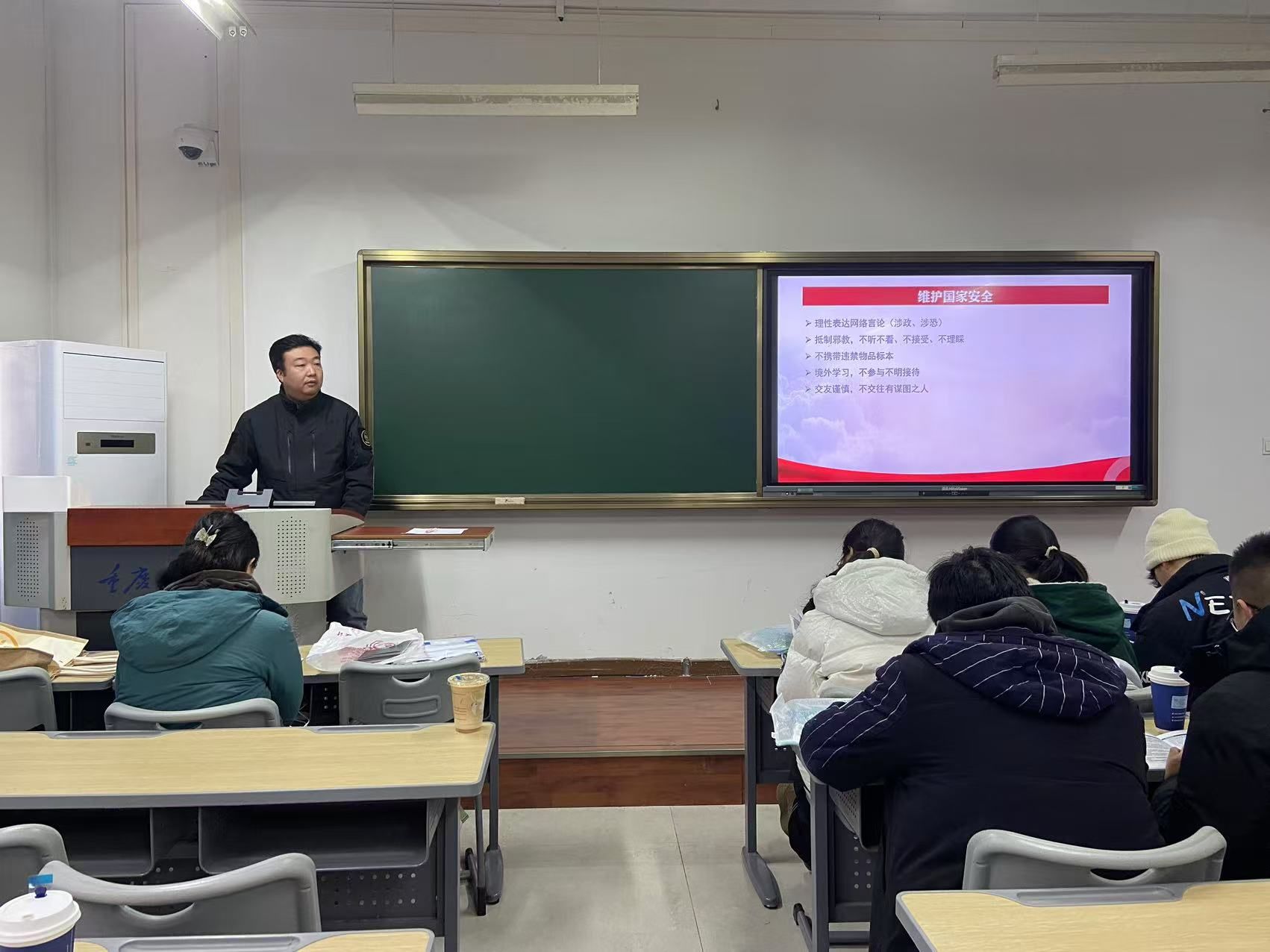 保卫处安全教育科刘郅祎以“安全才是人生的黄金准则”为主题进行了安全讲座。他强调了国家安全,要求同学们树立红线意识,并以具体的案例和生动的语言告诫同学们要有所判断、守住底线;介绍了各种突发状况下的自我防护方法,防范境外电信诈骗等相关知识。