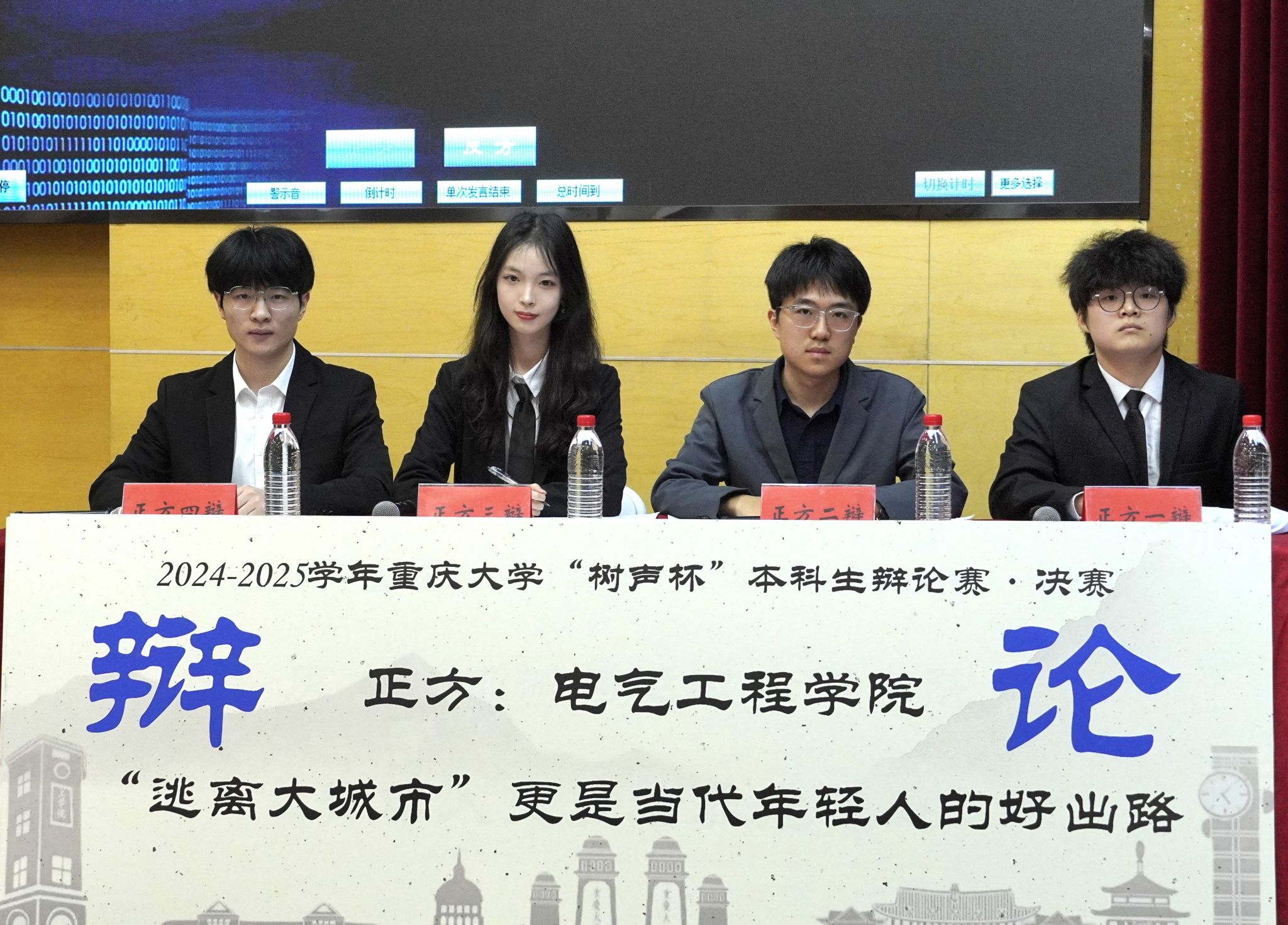 正方辩题:“逃离大城市”更是当代年轻人的好出路,机械与运载工程学院反方辩题:“逃回大城市”更是当代年轻人的好出路。本次辩论赛决赛是一场节奏紧凑、高光不断的攻防对决。前场阶段,比赛双方聚焦大城市生活样态。面对对方辩手的提问,我方辩手凭借对城市发展史的深刻洞察,精准拆解北漂、沪漂青年的真实困境,用翔实的数据和鲜活的案例,勾勒出年轻人在高竞争、快节奏、资源错配下的迷茫与挣扎,轻松化解了问题。进入中场阶段,面对焦灼的局面,我方辩手以产经视角破题,从产业布局、政策红利切入,层层递进,揭示中小城市被低估的发展潜力。通过生动的区域案例,有力论证了“小城亦能托举大梦想”的核心主张,并针对对方辩手提出的文化、医疗资源等质疑,给出了有力回应——小城的价值,不仅在于资源的多寡,更在于它为年轻人提供的“可能性”。进入终局阶段,我方辩手升华论点,直击本质:以大城市的齿轮式运转,往往让人陷入“无我”的异化状态;而回归小城,是把“生活”重新定义为“生存之上的诗与远方”。当年轻人不再被房价和通勤绑架,他们才能真正找回人生的选择权——这一价值共鸣,彻底点燃了全场观众的情绪。最终成功击溃了对方的辩论,夺得了本次五楼自拍