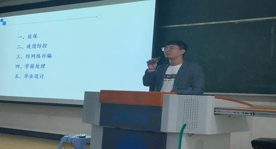 吴嘉副书记针对当前疫情防控的严峻形势做了部署,要求每位同学严格落实学校疫情防控政策,按时打卡,严禁无假离校离渝,做好个人防护;同时,中共二十大即将召开,要求同学们提高政治敏感性,坚定维护党中央的正确领导,用实际行动,迎接党的二十大胜利召开;吴嘉副书记对2019级同学的升学、就业情况做了详细说明,对已保研成功的同学表示祝贺,鼓励备考的同学继续努力,同时为找工作的同学提供了宝贵的经验。