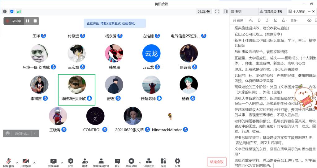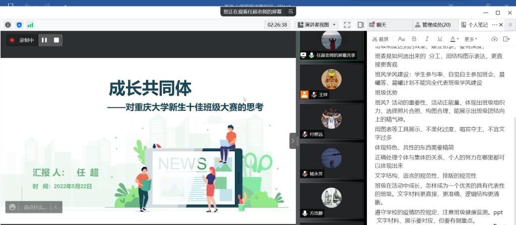 新生十佳班级”评选活动决赛培训在腾讯会议举办。本次培训邀请到党委学生工作部付修远老师和材料科学与工程学院任超老师,两位老师有着丰富的大赛组织和指导经验,对班级建设的理解新颖独到,富有指导意义。