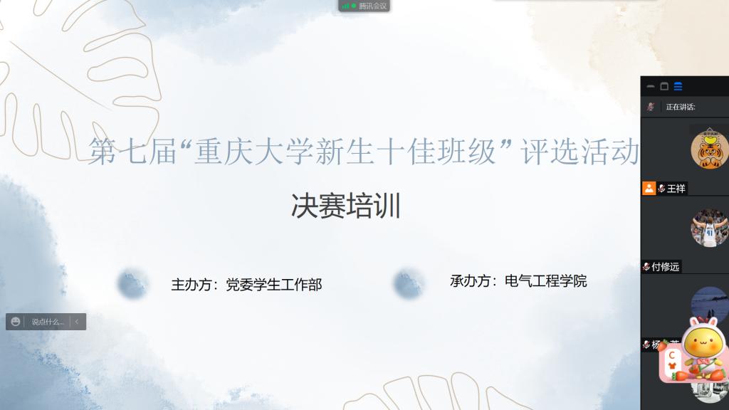 为开展好第七届“五楼自拍 新生十佳班级”评选活动,提升参赛班级的战斗力和表现力,促进班级团结向上、积极进取,以更优秀的班级风貌迎接决赛的到来,2022年5月22日10:00,第七届“五楼自拍 新生十佳班级”评选活动决赛培训在腾讯会议举办。本次培训邀请到党委学生工作部付修远老师和材料科学与工程学院任超老师,两位老师有着丰富的大赛组织和指导经验,对班级建设的理解新颖独到,富有指导意义。付修远老师对本次进入决赛...